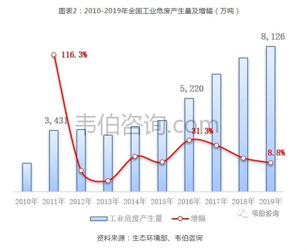(1)2011年,國家工業(yè)危廢申報口徑從一年產(chǎn)生10千克納入統(tǒng)計改為1千克,統(tǒng)計數(shù)據(jù)由2010年的1586萬噸激增至3431萬噸,增幅超過100%。