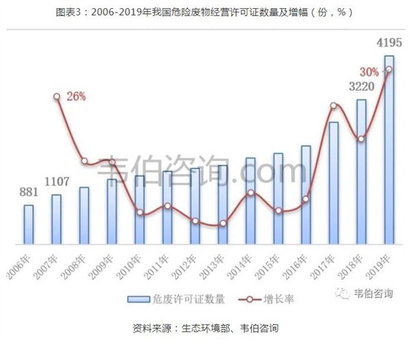 據(jù)根據(jù)我國生態(tài)環(huán)境部發(fā)布的《2020年全國大、中城市固體廢物污染環(huán)境防治年報》:2006年,全國危險廢物(含醫(yī)療廢物)許可證數(shù)量僅有881份,此后數(shù)年不斷增長,近三年增長最快,截止2019年底達到4195份,同比增長30%,相比2006年增長了376%。