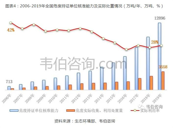 隨著經(jīng)營許可證數(shù)量的增長,全國危險廢物持證單位核準能力和實際收集和利用處置量快速提升。截至2019年底,全國危險廢物(含醫(yī)療廢物)經(jīng)營單位核準收集和利用處置能力合計12,896萬噸/年(含收集能力1,826萬噸/年),危險廢物實際收集和利用處置量達到3,558萬噸(含單獨收集81萬噸),相比2006年分別大幅增長17倍和11倍。但由于大部分企業(yè)處理規(guī)模較小,未形成有效處理產(chǎn)能,因此市場整體產(chǎn)能利用率不高。