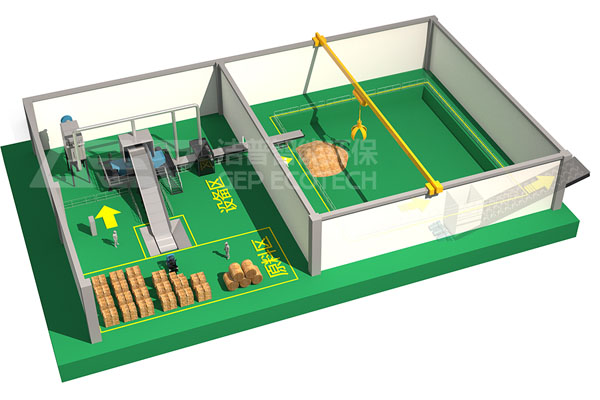 設(shè)備選型為雙軸剪切式破碎機(jī),處理產(chǎn)量為每小時(shí)50-60噸的秸稈捆料,處理后的尺寸滿足焚燒要求。雙軸剪切式破碎機(jī)是核心設(shè)備,低轉(zhuǎn)速大扭矩工作原理在設(shè)備工作過程中將設(shè)備噪音降到比較低,兩個(gè)轉(zhuǎn)子刀具對向剪切將大件垃圾物料剪切成較小塊狀,便于下一步精細(xì)化處理。設(shè)備刀具材料選用歐洲進(jìn)口材質(zhì),由潔普自主加工生產(chǎn),保證設(shè)備刀具使用壽命更長,日常經(jīng)營成本減少了刀具維護(hù)這塊。主機(jī)設(shè)備增加檢修維護(hù)平臺,便于日常設(shè)備的檢修維護(hù)提供空間操作。