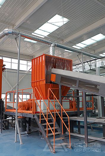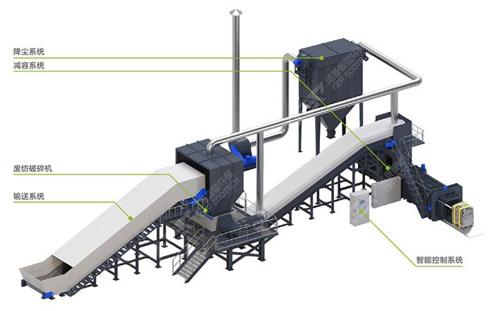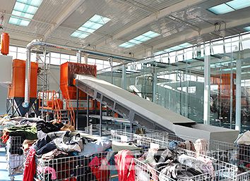 廢紡織物通過分揀、分類,再經(jīng)由潔普廢紡織物處置生產(chǎn)線進行粉碎處理,順著皮帶傳送機被運入車間內(nèi)打包機進行打包處理。這些破碎處理的物料被轉(zhuǎn)運至下一道處置工序進行處理,實現(xiàn)資源合理化應(yīng)用。